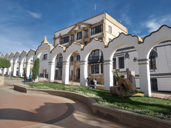 Adorei a praça central com os arcos brancos.