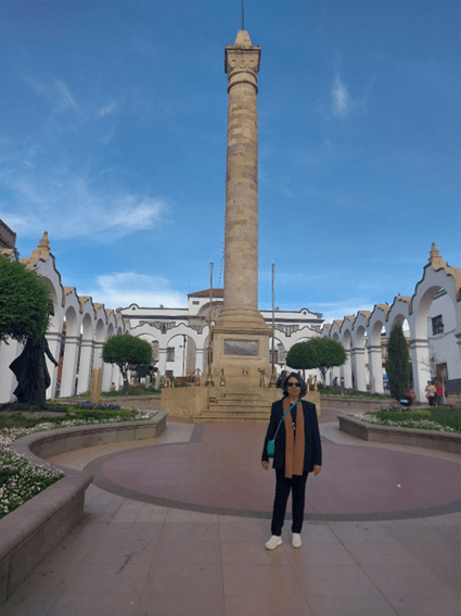 Apreciar a Plaza 6 de Agosto lá de cima, possibilitou constatar que ela é tão linda como vista de baixo, a qual curti sentadinha, no mesmo final de tarde, e diante do seu obelisco, no seguinte.