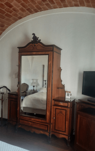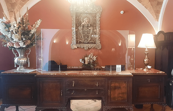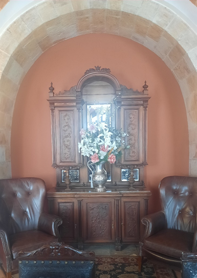 Não é uma boa ideia usar um antigo aparador de louças para fazer as vezes de balcão de recepção? Que tal a maravilhosa madona em prata que recebe os hóspedes? E o vaso de prata com flores artificiais tão bonitas que esquecemos o detalhe de serem fakes?