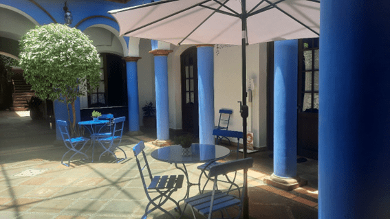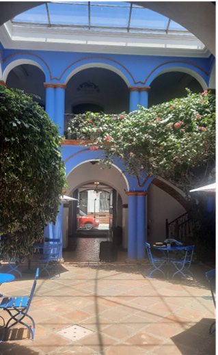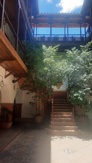 Além do pátio azul anil, outros dois estão na sequência, para os quais estão viradas as portas dos apartamentos. O frescor das plantas e da sombra agrada muito, porque mesmo estando nos Andes, ao meio do dia, as temperaturas se elevam um pouco e o sol é implacável.