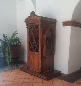Num outro cantinho, nada mais, nada menos do que um confessionário em madeira. Que pecados poderíamos confessar aos deuses num ambiente tão adorável? O da luxúria?