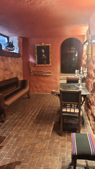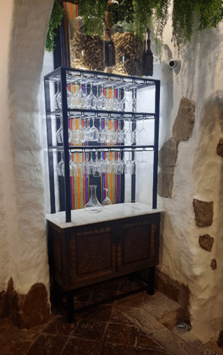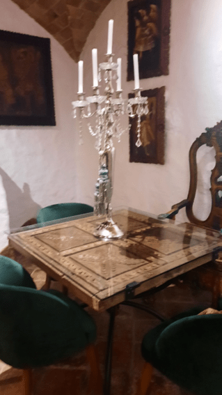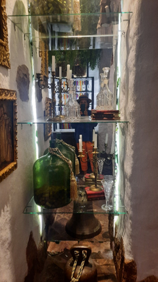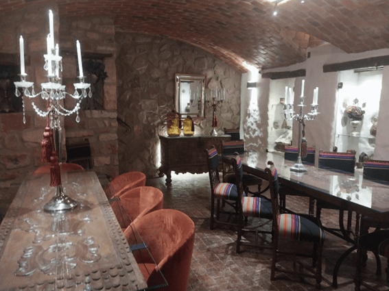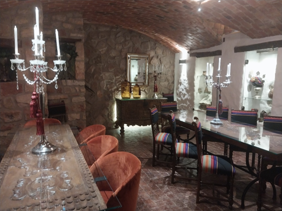 À medida que se passa por ela, vamos conhecendo salas, recentemente decoradas que compõem, um restaurante especial, aberto apenas quintas, sextas e sábados. Perdemos, assim, a chance de comer nele, já que estivemos no hotel entre domingo e terça feira.  Tudo é caprichado nesses ambientes – as prateleiras com as taças de cristal, os objetos antigos à mostra como o garrafão verde que deve ter guardado muito vinho no passado, mesas de madeira estilo europeu com cadeiras forradas com tecidos étnicos dos indígenas da América do Sul, as salinhas ou cantinhos menores, com mesas para duas pessoas…