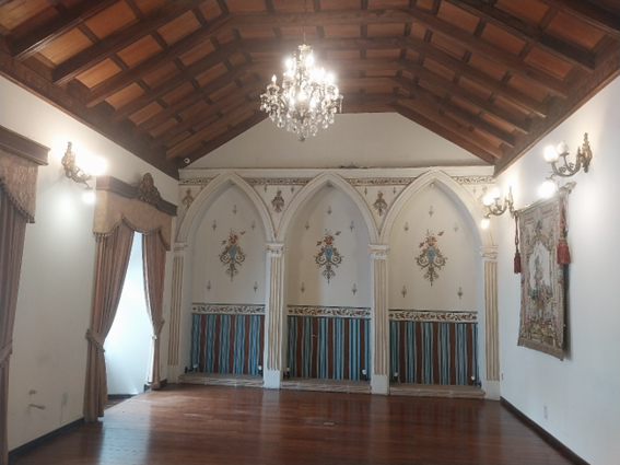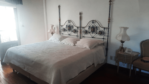O hotel tem dois salões bastante grandes. Um dele estava sendo preparado para o casamento do filho mais jovem de Luís, que é o decorador do ambiente do subsolo e de outros do hotel. Um segundo salão é este das fotos, que também pode ser locado para eventos e no qual se destacam os adornos da parede, originais e oriundos da França. Vejam também na lateral o tapete gobelin francês. Na outra ponta do salão, móveis de escritório também muito bonitos (é verdade, leitor, que as fotos ficaram mal enquadradas, desculpe-me, mas Luís era rápido no tour ao hotel).