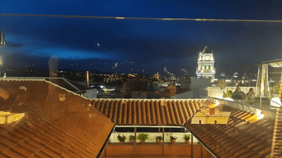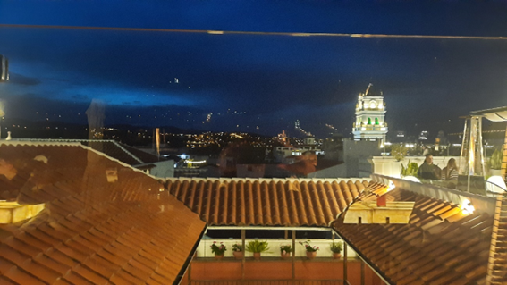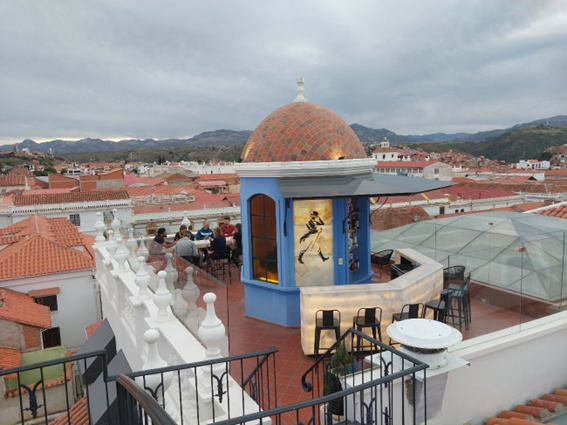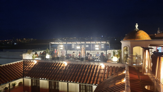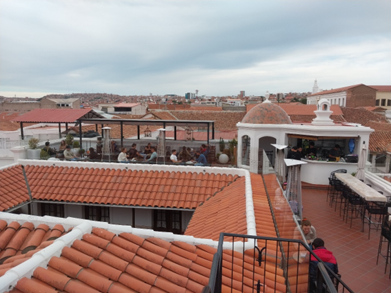 Ao final da visita, Luís nos sugeriu vivamente que, fossemos ver, naquela tarde, o pôr do sol na varanda que ficava acima do terceiro piso. Obedecemos, é claro. Chegando lá, encontramos um ambiente preparado e frequentado por jovens. Tivemos apenas dois minutos de inadaptação, porque era tudo tão agradável que sentamo-nos numa pequena mesa, tomamos um tinto e comemos uma pizza feita ali mesmo. Os garçons eram extremamente agradáveis. Discretamente fiquei observando a moçada, que, na vestimenta, é claro, não tem mais nada de cholitas.