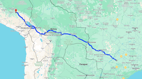 E o segundo representa o de volta: Cusco, Puno, Oruro, Colchani – Salar de Uyuni, Potosí, Sucre, Santa Cruz de La Sierra, Corumbá, Campo Grande, Presidente Prudente.