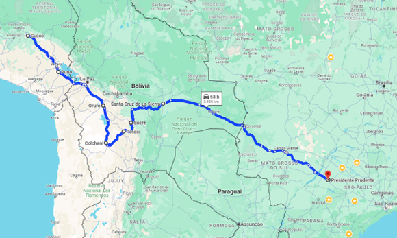 O roteiro foi tão longo que, pelo Google Maps, não foi possível representá-lo num único mapa, porque ultrapassava os dez pontos permitidos. O ponto mais distante a que chegamos foi Cusco, no Peru. Assim, é como se o primeiro mapa representasse o percurso de ida: Presidente Prudente, Campo Grande, Corumbá, Santa Cruz de la Sierra, Cochabamba, La Paz, Copacabana, Cusco, indicando apenas as cidades onde pernoitamos.