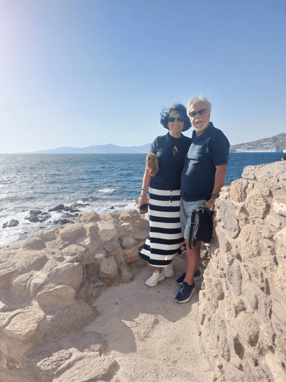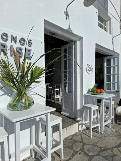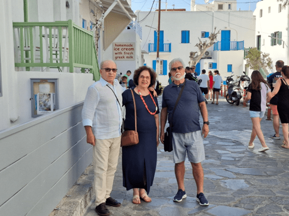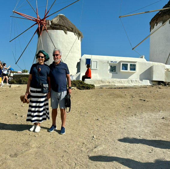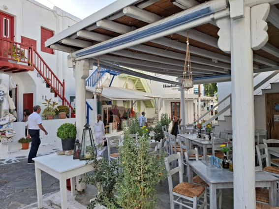 Para irmos ao centrinho de Mykonos, onde tudo acontece, chamamos um táxi que nos cobrou 15 dólares para percorrer 2 km. Hoje a cotação do dólar chegou a 6 reais. Achamos o preço alto e depois soubemos que os táxis são proibitivos na ilha; por isso todo mundo aluga um carro, uma moto ou um quadriciclo. Não foi o nosso caso, mas serviu para aprender.