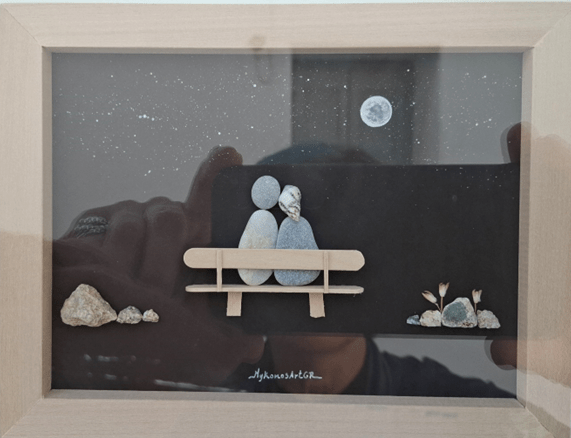 De todas as lojas, a que eu mais gostei foi a que vendia as obras de uma artista, as quais são feitas com pequenos seixos que estão ali mesmo na praia. Vejam que graça um dos quadros dela.
