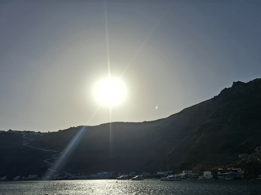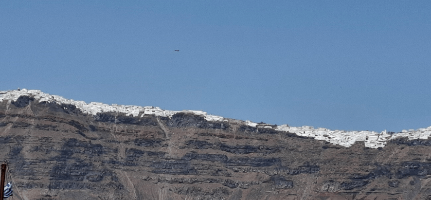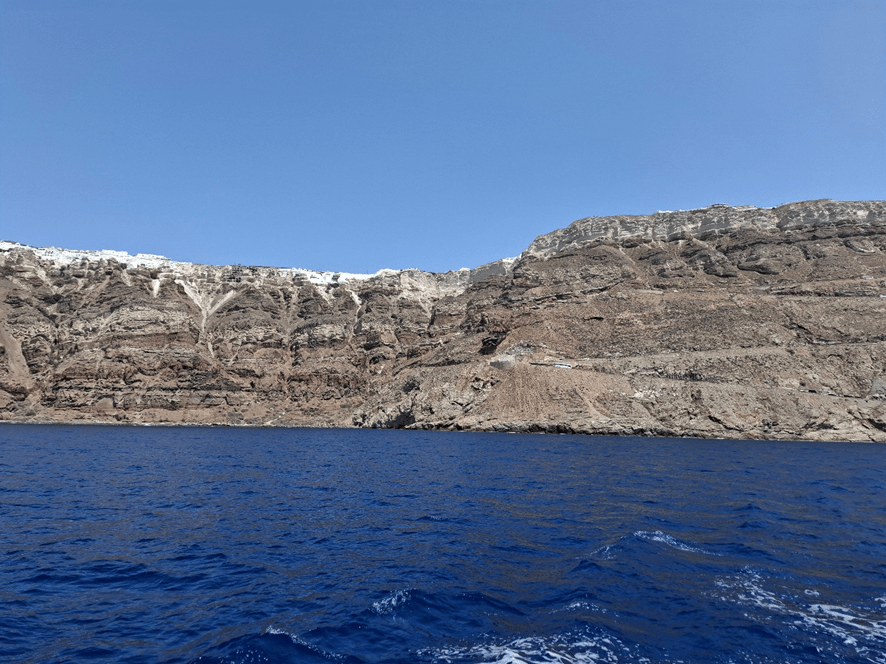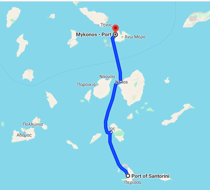 A distância entre Mykonos e Santorini é de 135 km, mas foram necessárias mais de três horas para fazer o percurso, menos do que o indicado no Google Maps, mas ainda assim um tempo considerável. Dento do navio, temos a sensação que ele navega rapidamente, mas fazendo as contas, ele pouco avança além dos 40 km por hora.
