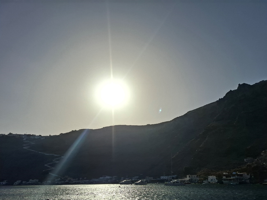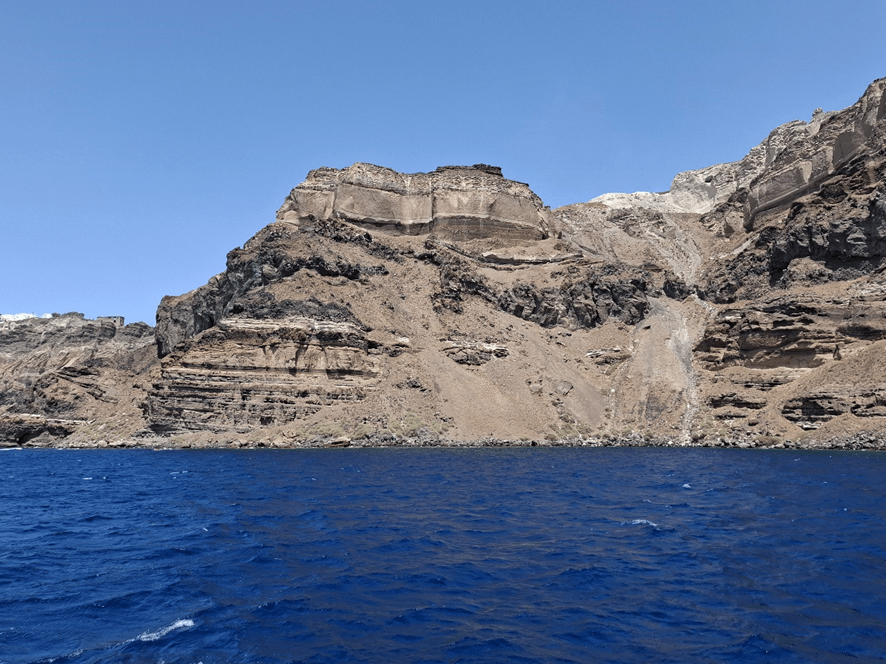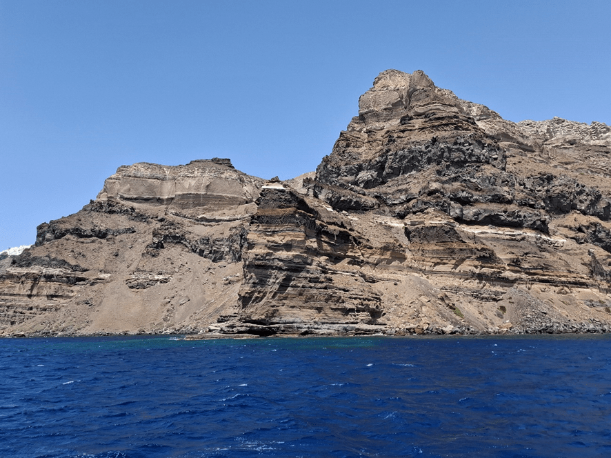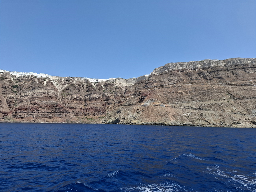 Ao nos aproximarmos do desembarque já começamos a apreciar o desnível acentuado que marca a face oeste da ilha e o maravilhoso contraste entre sua formação rochosa de tons acinzentados e o azul do mar. Várias vezes já escrevi sobre os azuis da Grécia – do céu e do mar – e tantas outras escreverei… É divino!