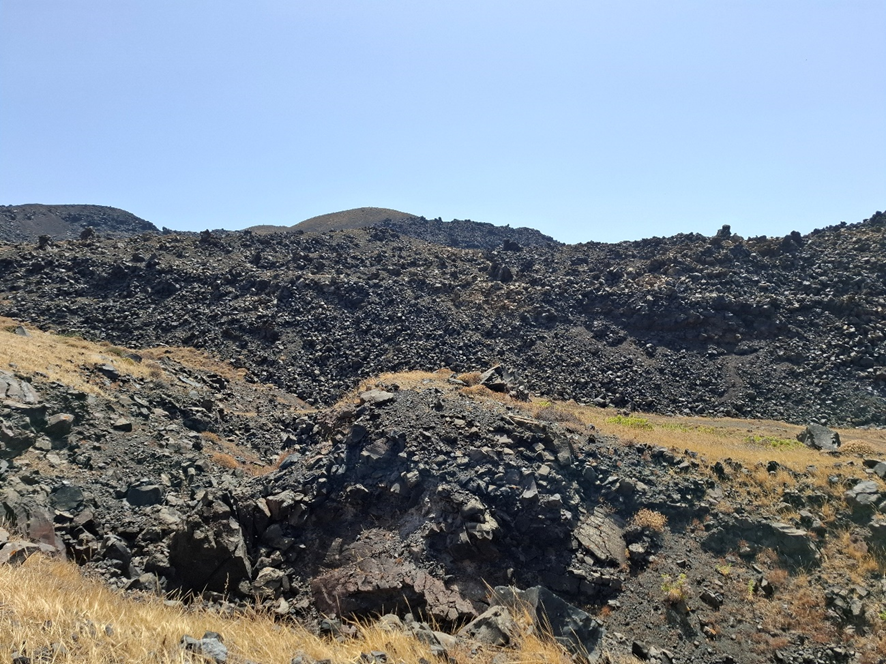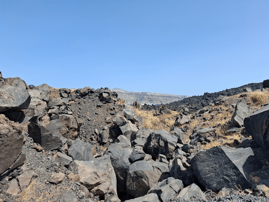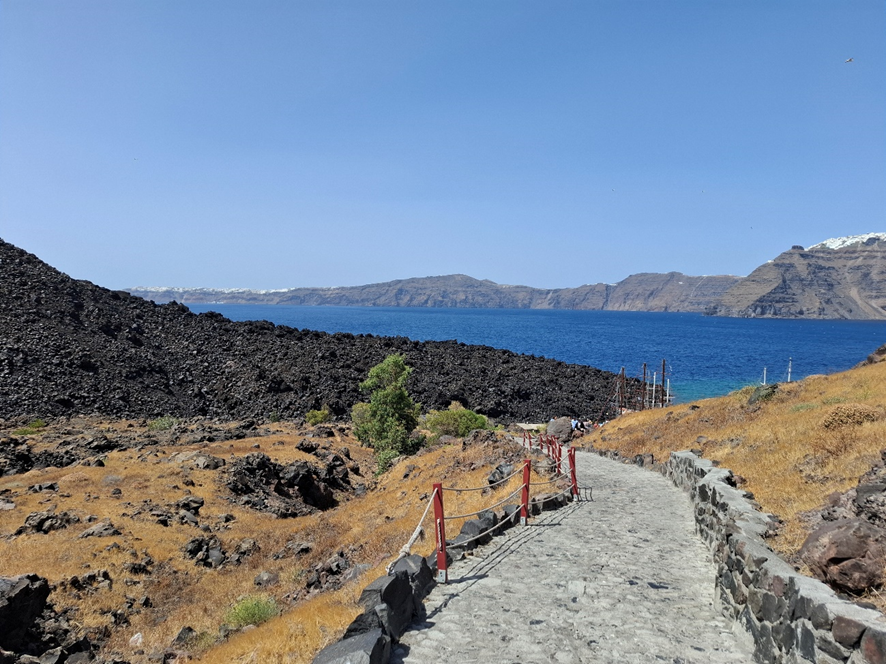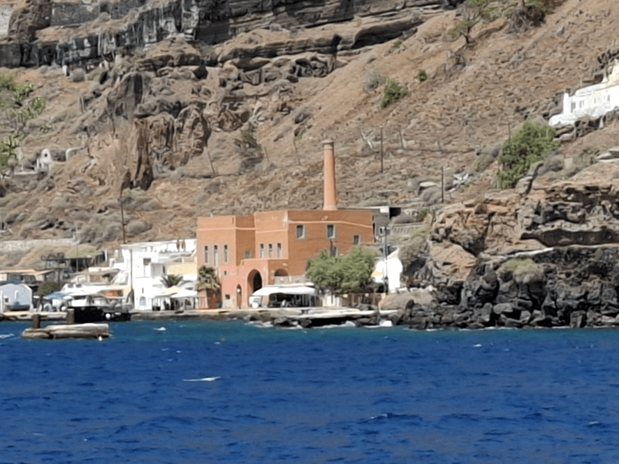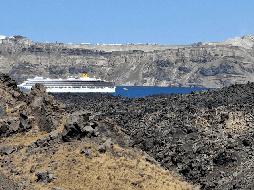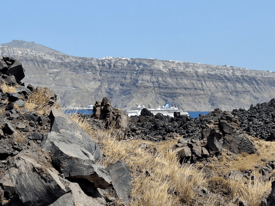 Da popa, fiquei observando a terra ficar cada vez mais longe para nos aproximarmos da Ilha Nea Kameni (que significa queimada jovem), conhecida como a ilha do vulcão Gheorghios. Mais de um transatlântico navegava nesta porção de mar.