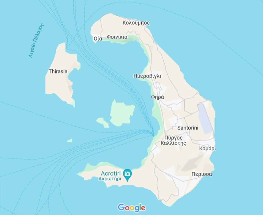 Do ponto de vista da extensão territorial, Santorini era maior, mas em 1550 a.C. (as datas variam segundo os sites que consultei) houve uma grande erupção vulcânica, que provocou um tsunami com ondas de mais de 100 metros que inundaram a ilha e a dividiram em quatro partes. A população minoica que aí residia foi dizimada neste evento natural.