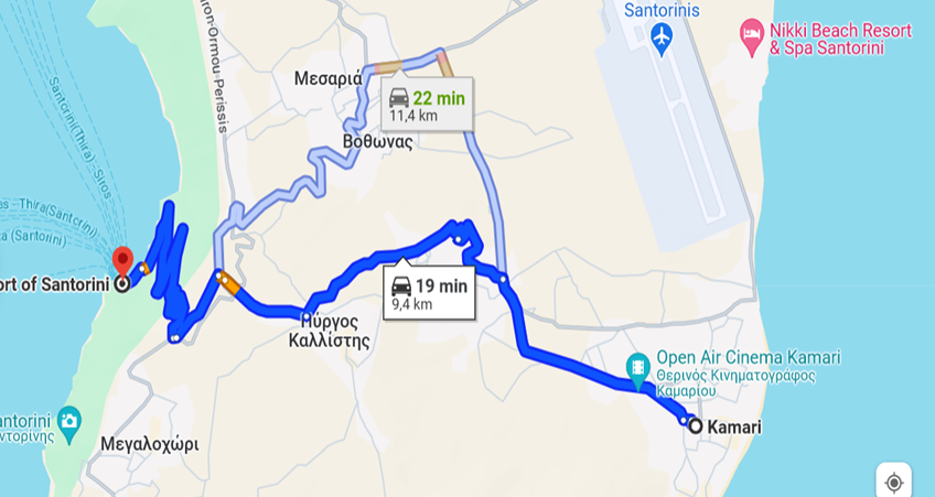 Para chegarmos a Kamari, subimos por uma estrada muito tortuosa (veja o ziguezague na porção oeste do mapa), que ia oferecendo vistas cada vez mais bonitas do porto e do mar.