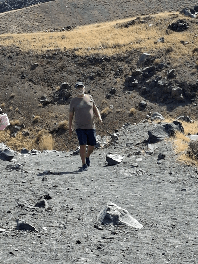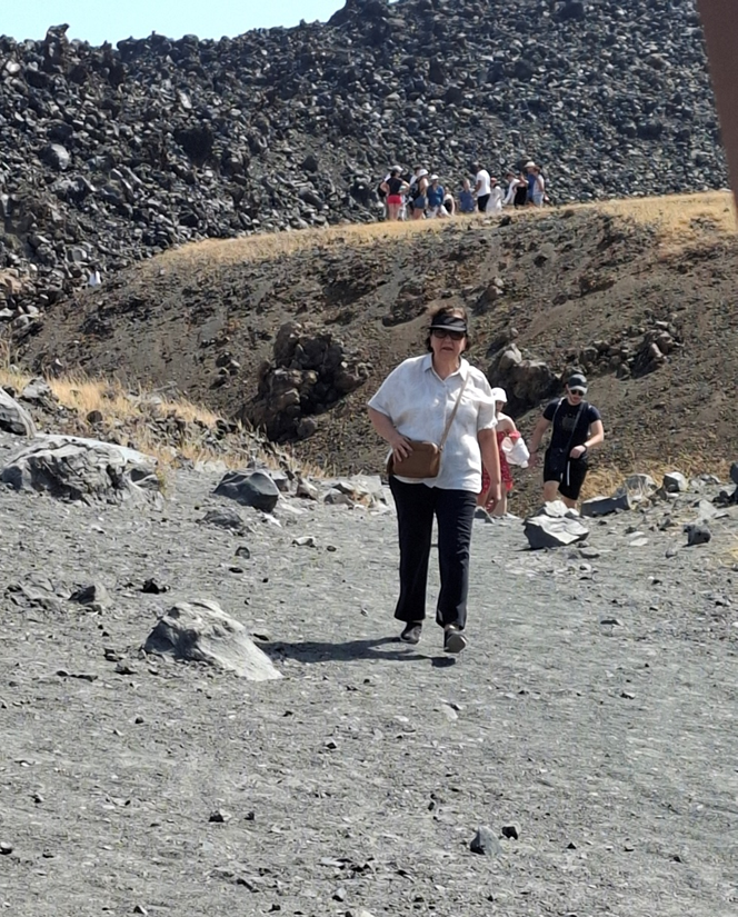 Quando chegamos à primeira parada da subida, onde nosso guia de origem afro, num inglês péssimo, deu as devidas explicações, eu senti que não queria continuar. Nem estava animada, nem é de meu grande interesse paisagens como esta. Decidi ficar ao abrigo do sol sob um pergolado que havia ali. Devo ter chegado, então, a 1/3 do percurso planejado. Os meus heróis da tarde foram minha amiga, que deve ter alcançado os 2/3 e meu marido que percorreu 100% e viu a boca do vulcão. Olha eles aí descendo de volta.