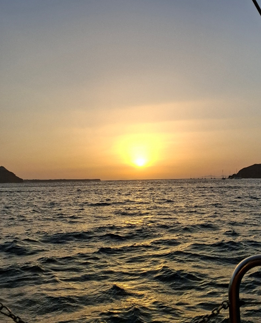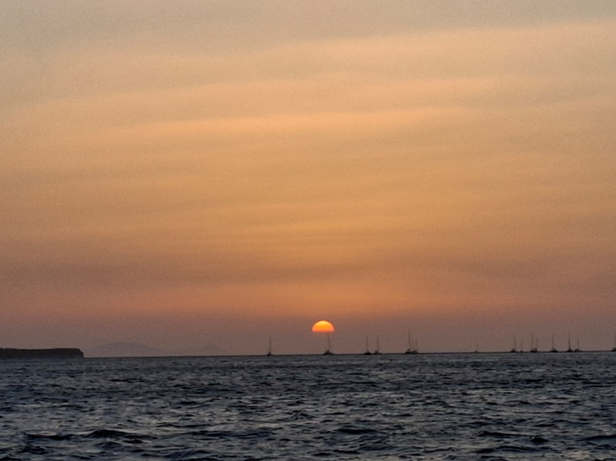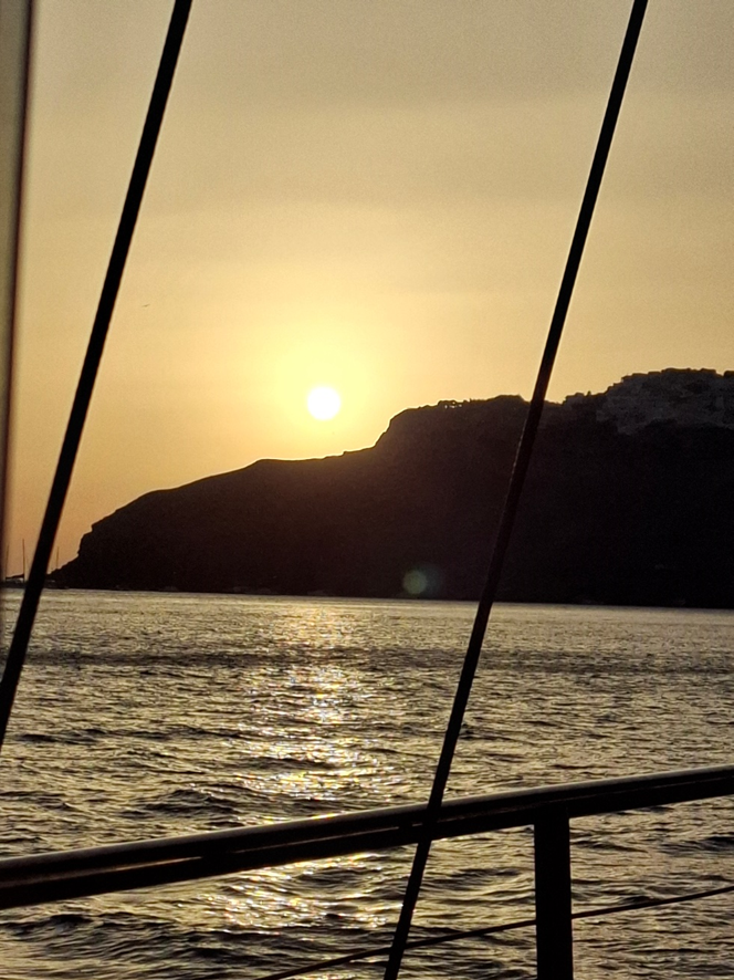 No próprio barco, foi servido o jantar, por volta de 19h30. Eles anunciaram um barbecue, mas as carnes oferecidas estavam mais para cozidas do que assadas. Tomamos um vinho tinto e ficamos apreciando o sol se pôr, tendo a ilha de Santorini e o mar como moldura.