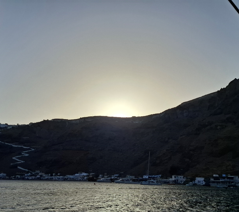 A forma em meia lua da ilha de Santorini lembra um croissant, segundo meu marido. O porto de desembarque, denominado Athinios, aparece na última foto e fica na parte côncava da ilha, a oeste, bem onde estão os fluxos de embarcações desenhados no mapa. Nós ficamos hospedados justamente do lado oposto, o convexo, a leste, num dos aglomerados urbanos da ilha, chamado Kamari, hoje totalmente voltado aos turistas com bares, restaurantes, hotéis, lojas de todo tipo e padrão.