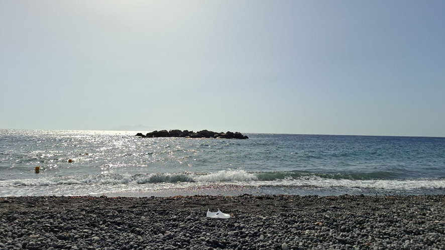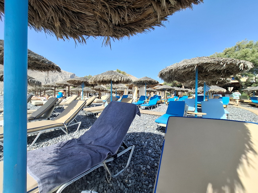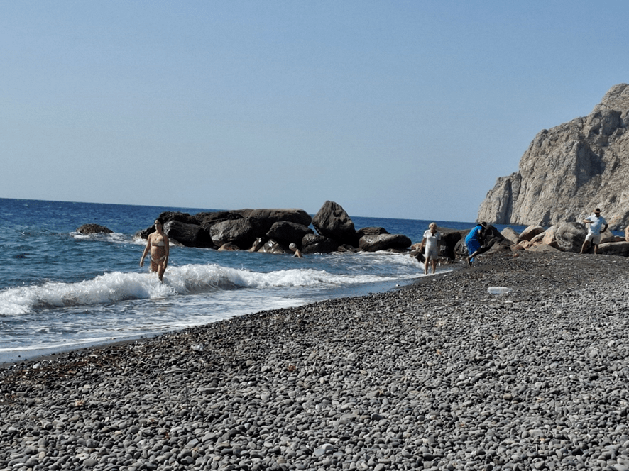 Voltamos à mesma praia na manhã seguinte. Areia? De jeito nenhum. Pedras vulcânicas que exigiam que a gente se deslocasse sempre calçado. Um mar de quiosques com espreguiçadeiras, aguardavam turistas de vários países do mundo, para ficar ali jacarezando e olhando o Egeu, desde que estivéssemos dispostos a consumir 10 euros cada um. O vento agradável amenizava o sol. Minha amiga e eu batemos longo papo sobre a vida, com direito a ficar emocionadas. Tomamos uma gostosa sangria!