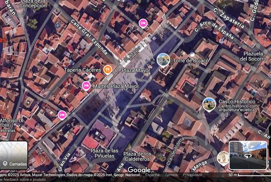 A partir da mesma torre, entre um pilar e outro, a Plaza Mayor abaixo, dominando a estrutura espacial da cidade atual.