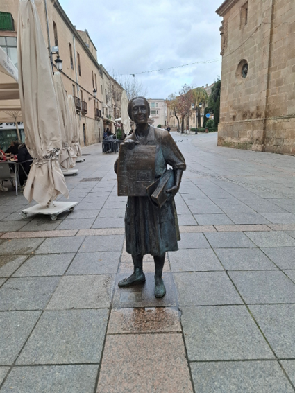 Já ia me esquecendo de voltar à parte “nova” da cidade para registrar a estátua de Leoncia Gómez que está na Plaza San Juan, perto da Gran Vía. Ela foi erguida em 1998 em homenagem a esta senhora que foi a última a vender pelas ruas de Cáceres o periódico Extremadura. Simpático né?