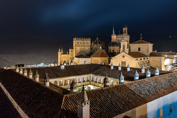 Visitar este pequeno aglomerado urbano não se deveu nem ao parador nem à eleição de melhor e mais bela aldeia da Espanha, mas sim ao Real Monastério de Santa María Guadalupe. Sua história é longa. Fizemos a visita durante o dia e tivemos uma visão parecida à da foto que se segue. Pela outra, registrada à noite, tem-se uma ideia do conjunto que compreende essa instituição.