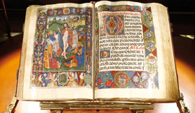A outra sala da qual gostei muito foi a do Museu dos Libros Miniados, onde estão lindas e enormes brochuras escritas e desenhadas a mão, finamente ornadas também em ouro. Destacava-se o Libro de Horas del Prior, que achei mais bonito do que ele aparece na foto que se segue, retirada do site https://monasterioguadalupe.com/arte-cultura/cantorales-y-libros-miniado/