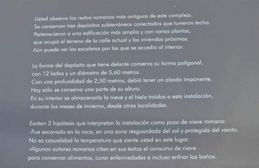 Começamos o passeio pelo sítio arqueológico do poço romano de neve. Os romanos a transportavam das encostas mais elevadas da serra e a armazenavam tanto para preservar alimentos, como para, em caso de necessidade, descongelar e aumentar o estoque de água. A explicação do painel ajuda mais a entender a finalidade daquela construção, do que as formas materiais que restaram.