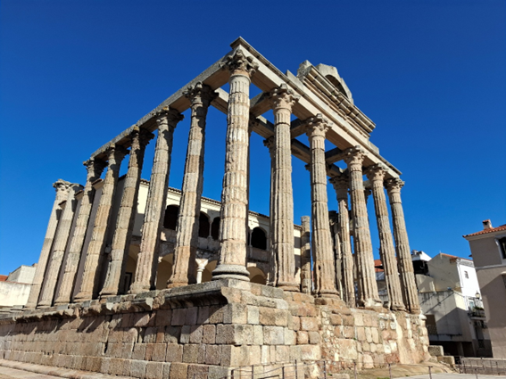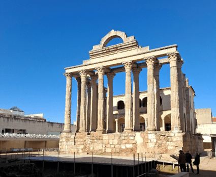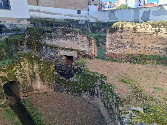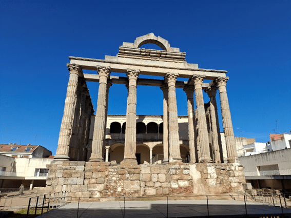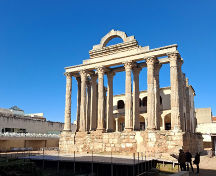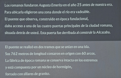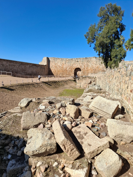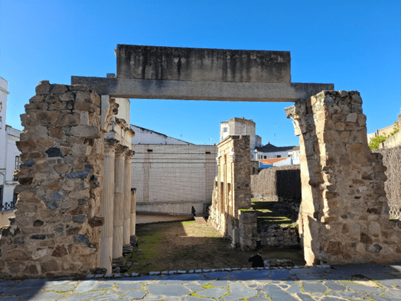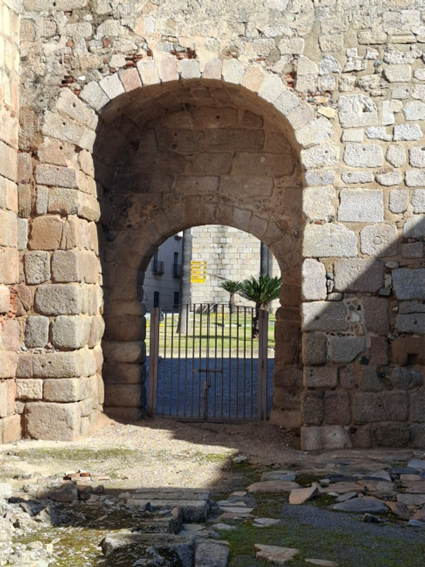 O patrimônio deixado pelos romanos está disperso na atual área central da cidade. Assim, diferentemente do que vimos em Cáceres e Trujillo, onde a cidade medieval está claramente distinta da cidade atual, no caso de Mérida, o que se tem é uma mescla, que surpreende o visitante. Muitas vezes, do nada, caminhando por uma rua comercial, chega-se a uma edificação de séculos de existência. Enquanto caminhamos, vamos constatando que a Mérida Romana está integrada à Mérida Hispânica.