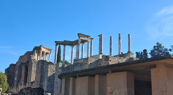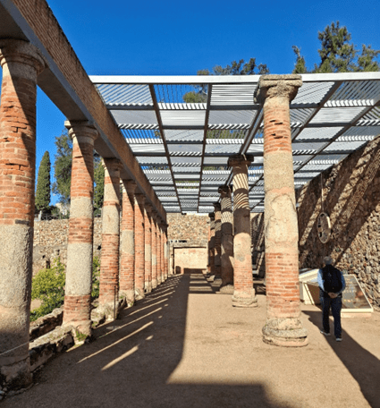 Em outros sítios arqueológicos romanos ou gregos que conheci, áreas como a que se seguem eram as destinadas ao comércio. Em Mérida, não havia uma explicação para essas colunas, mas deduzi que podia ter sido essa a função deste espaço. Só não foi possível entender as razões que orientaram a desse brise de alumínio acima delas. Não servem nem para protegê-las do sol nem da chuva e, ademais, competem visualmente com as próprias colunas.