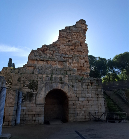 O anfiteatro está especialmente bem conservado, com a fachada posterior ao palco quase completa com suas colunas e cinco esculturas, uma ao meio e duas de cada lado.