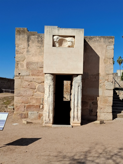 Dentro da fortaleza, está a edificação onde morava o governador. Dela, além de parte das paredes laterais, ainda restam duas colunas e o adorno que, originalmente, estava em posição mais elevada. Uma parte delas das colunas não restou para sustentar o que, suponho, era símbolo do poder muçulmano sobre este território. Segundo as informações contidas nos painéis, os moradores de Mérida não aceitaram pacificamente o domínio árabe, razão pela qual a fortaleza era, de um lado, para demonstrar o poder e controle sobre a entrada da cidade, na sequência da ponte, de outro tinha a função de atacar os moradores da cidade, quando estes se rebelavam contra o dominador.