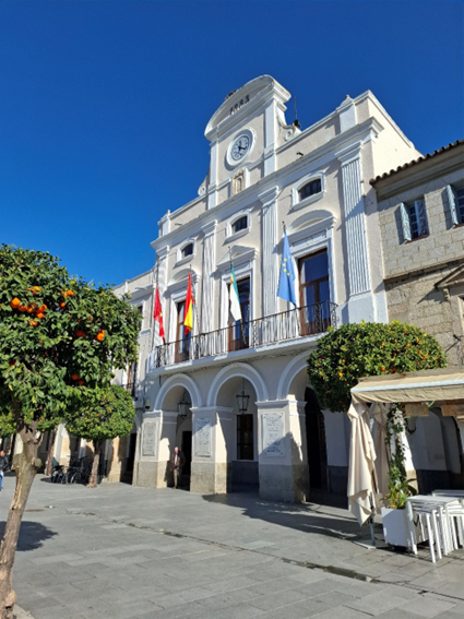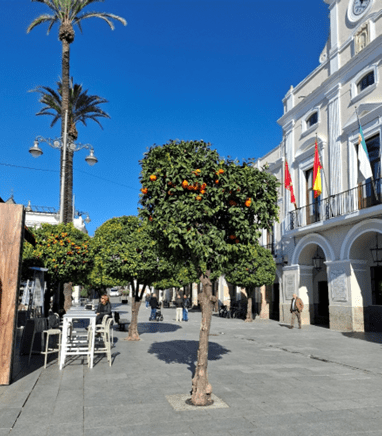 Além da herança romana e da árabe, Mérida também tem um patrimônio hispânico considerável de construções do século XIX e começo do XX. Grande parte está em ruas tornadas exclusivas para pedestres, que estão adornadas com as árvores carregadinhas de cítricos (laranjas, limões sicilianos e mexericas). Acho que é proibido colher, porque não vi ninguém sequer tocar em uma das frutas que estavam maduras convidando ao pequeno delito. Consegui resistir e com medo dos carros com a inscrição Polícia Social, que rondavam por todo lugar, não colhi uma frutinha sequer.