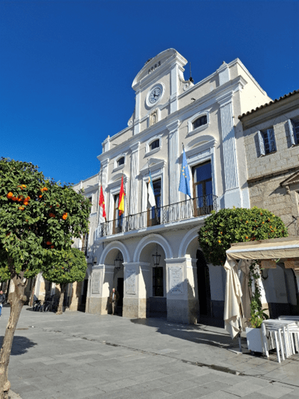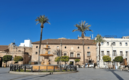 O hotel da rede “Paradores de Espanha”, em Mérida, está situado na Plaza Mayor, onde outras edificações compõem o patrimônio hispânico desta cidade.