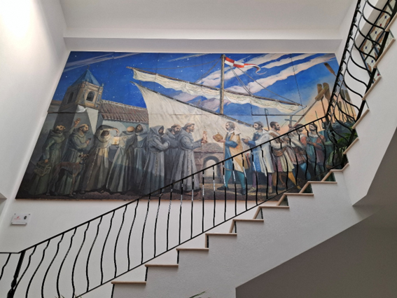 No pátio interno, onde está a escadaria que dá acesso aos gabinetes de trabalho, um enorme painel sobre o descobrimento da América.