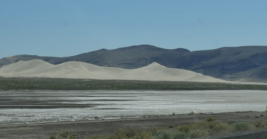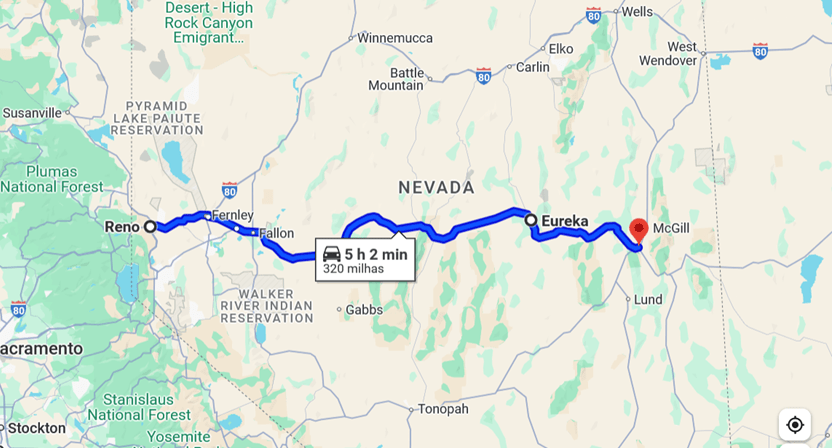 Nossa intenção era dormir em Eureka, mas daqui a alguns parágrafos, conto porque mudamos de intenção. Primeiro quero descrever um pouco a sensação da travessia do deserto (veja o mapa que se segue), que pareceu diferente, por ocasião do percurso realizado em 2011, mais ao sul, entre Flagstaff, no Arizona, e Las Vegas, em Nevada.