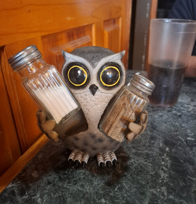 Sob o sol intenso, chegamos no Owl Club Bar and Steakhouse. O nome é pomposo, as fotos no Google são até razoáveis, mas o leitor não tem noção do que encontramos lá: um lugar escuro, mas até onde eu podia enxergar, bastante sujo. A solução foi pedir um sanduíche que veio com o pão de forma quente e o presunto e o queijo semi congelados. Deu para curtir o bacon fritinho e seco e as batatas fritas….Para você ter uma ideia do que era, veja o objeto decorativo que ampara o sal e a pimenta em cada mesa.