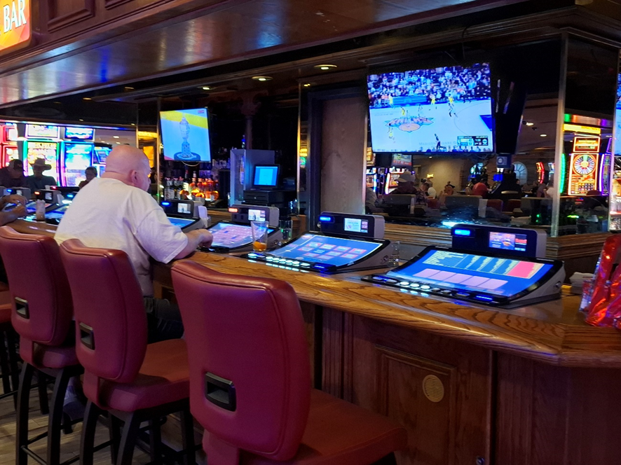 Para as finalidades de quem a implantou, não é sem sentido a estratégia que desenvolveram para não afastar o jogador do jogo, enquanto se alimenta ou bebe uma: o balcão do bar já está equipado com as máquinas (vejam a próxima foto). Assim, ao mesmo tempo que se espera pelo hamburguer com fritas e mais um chopp, as apostas vão sendo feitas e, em alguns casos, a própria máquina recebe as notas de dólar, evitando a perda de tempo de ir até o caixa, quando as fichas acabam.