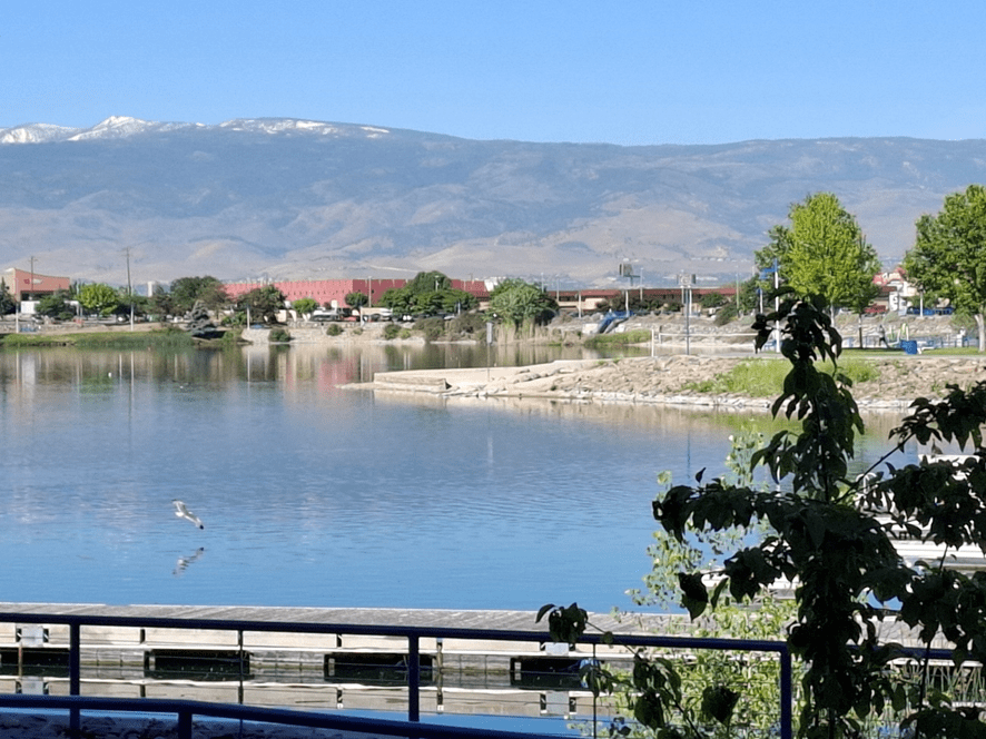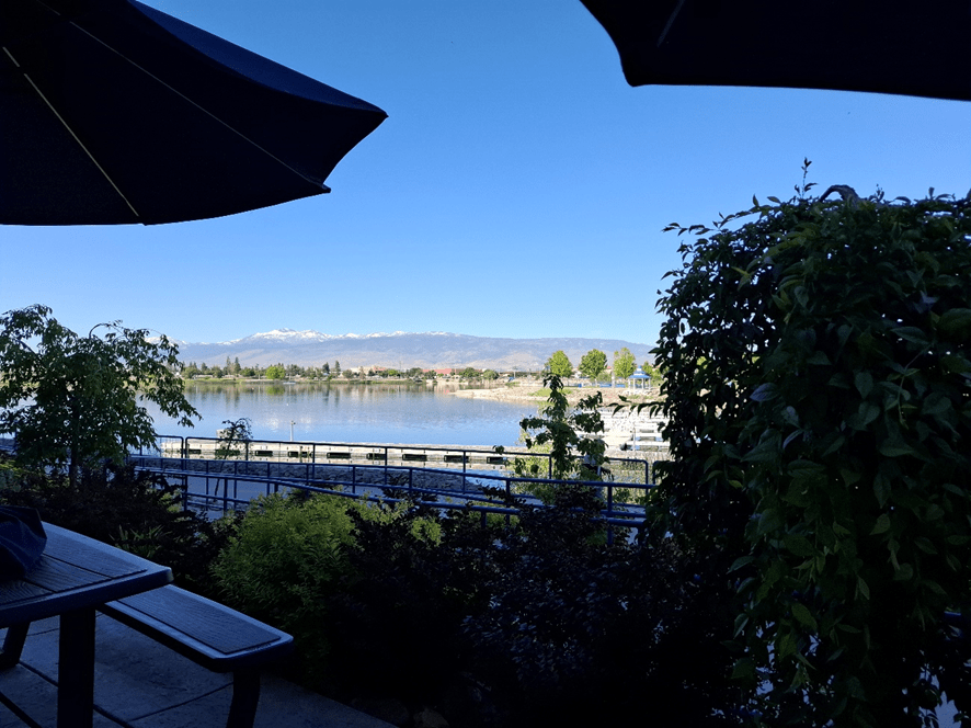 No dia seguinte, tomamos café da manhã diante de um pequeno lago que tem em Reno, olhando para as Rochosas ao fundo. Um ambiente agradável, iluminado, ventilado e suave: bem diferente daquele do hotel.