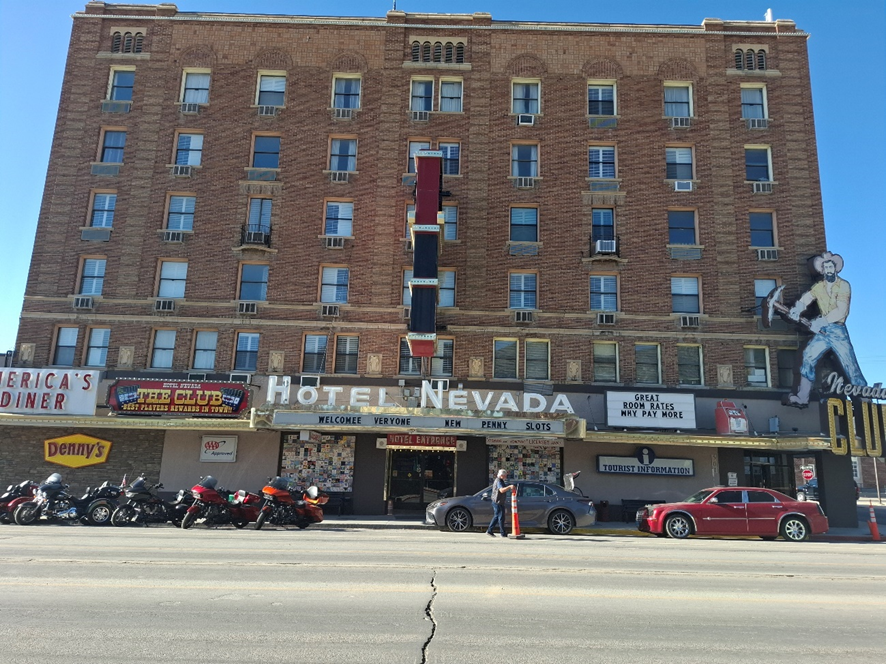 A cidade encontra-se a pouco mais de 1900 m de altitude e está cercada por montanhas e muita aridez. Nossa opção de hospedagem (até parece que havia muitas) foi no Hotel Nevada and Gambling Hall que, para minha surpresa, é destacado na Wikipédia, no verbete sobre a cidade: