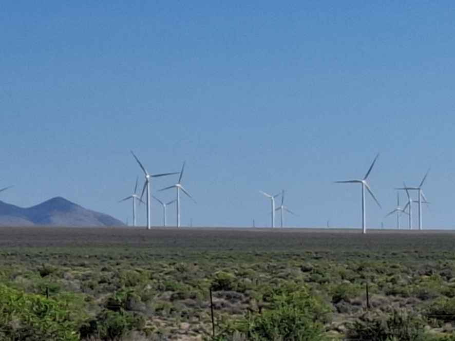No sopé das Rochosas encontramos, num dado trecho, muitas torres de energia eólica. Elas pouco se moviam, mas imaginei que, no inverno, o vento deve correr solto ao longo da cadeia montanhosa.
