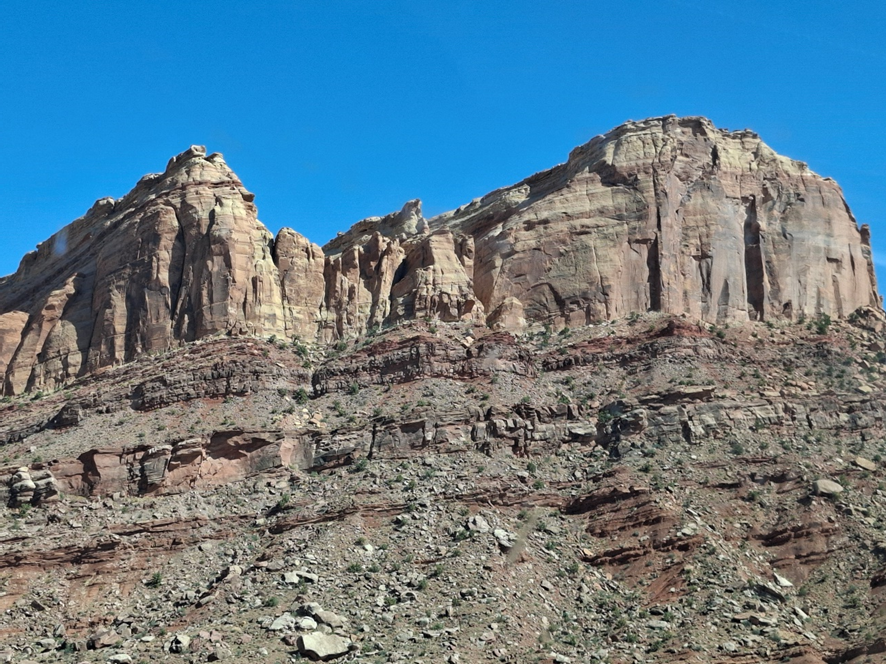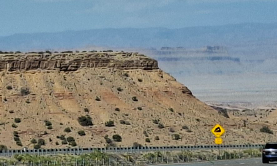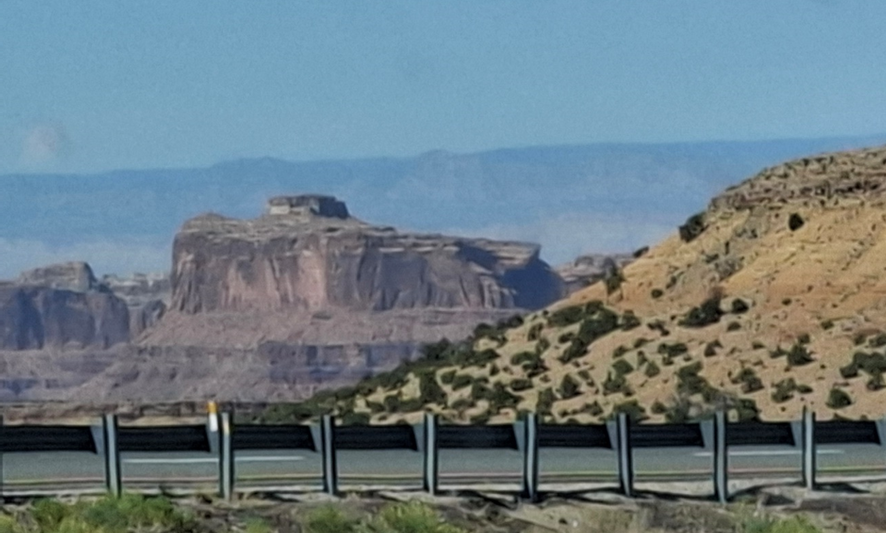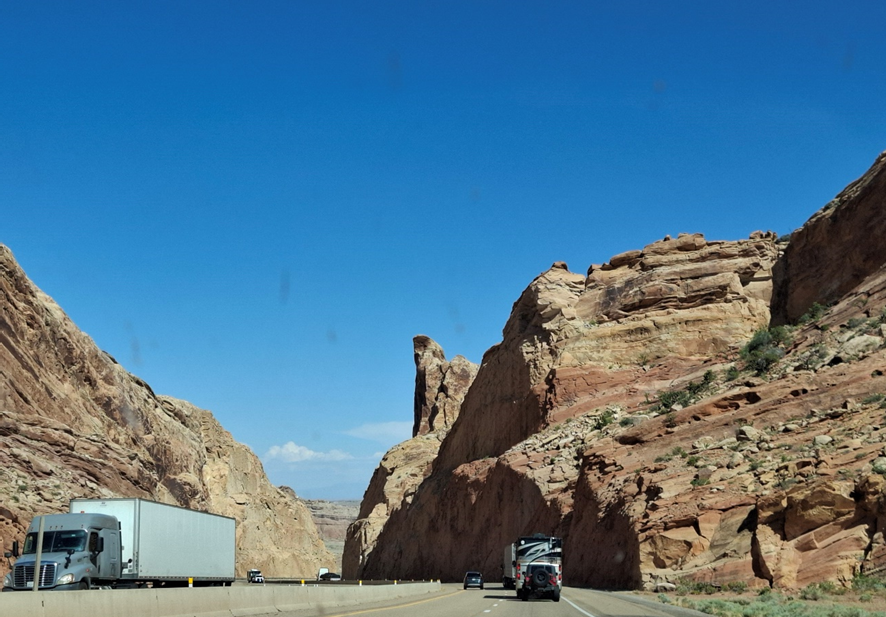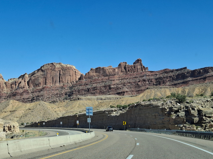 De Hinckley, após o lanche, sem nada gelado para beber porque não encontramos um café, bar ou mercadinho na cidade, seguimos para Green River, onde iríamos dormir, percorrendo 530 km pelo deserto. A partir de Salina deixamos a US 50 e tomamos a autopista US 70. Vejam que passamos por vales, onde observamos o desenvolvimento da agricultura com irrigação. Aliás, já tínhamos notícia de que os mórmons vêm se dedicando, desde que chegaram à região, ao desenvolvimento de técnicas e equipamentos para irrigação, afinal, tinham que transformar solo pedregoso e terra fértil.