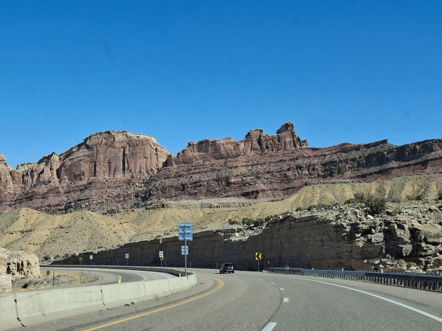 O brilho do sol é maravilhoso para tornar as paisagens exuberantes, mas após um dia de viagem, nossos olhos estavam cansados de tanta luminosidade. Chegar ao hotel em Green River foi ótimo. Quando saímos do carro às 17h30, o calor era ainda intenso.