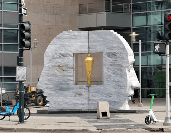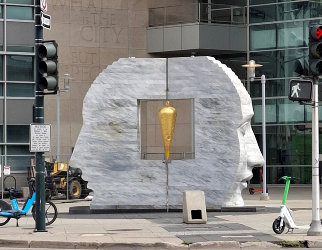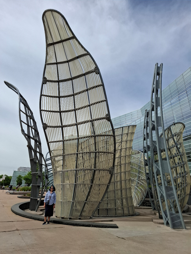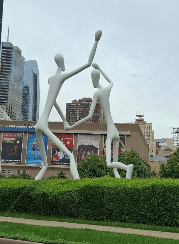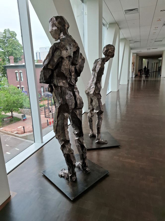 Este prédio da foto compõe um complexo cultural, com mais duas edificações com obras de arte e uma outra, mais antiga, que abriga a principal biblioteca de Denver. Esse complexo está na área central, muito perto do capitólio (vou escrever alguma coisinha sobre ele logo mais) e da área onde estão as principais instituições associadas ao poder Judiciário no estado do Colorado. Para ligar duas dentre estas edificações, há uma galeria de vidro que passa por cima da rua e na qual duas esculturas apreciam a vida, uma olhando para a cidade e a outra para nós que passávamos de um ambiente ao outro do museu.