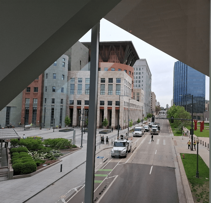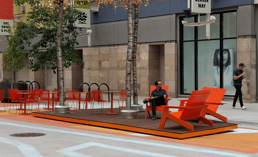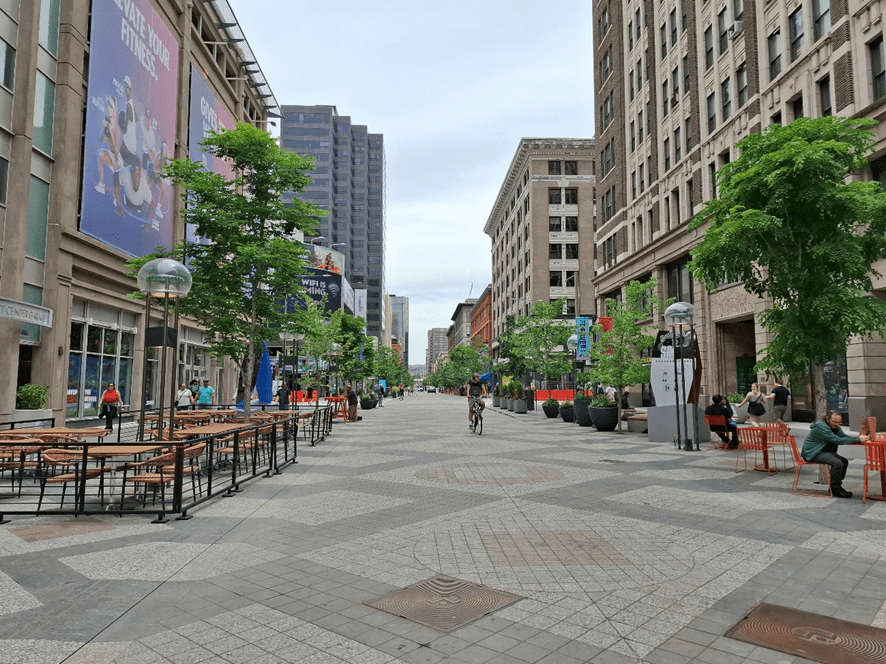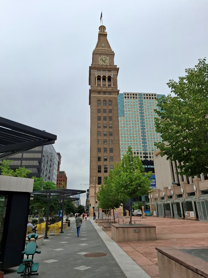 Dali seguimos para a 16th Street, a principal rua comercial do centro de Denver. Ao longo dela, estão galerias e pequenos malls com lojas, cafés, restaurantes de fast food principalmente. Trata-se de uma rua, em grande trecho, preparada para os pedestres, mas não apenas para eles passarem e comprarem, mas sobretudo para eles estarem. Havia bancos e mesas ao longo de todo percurso e ali se via gente de todas idades, gêneros, raças e condições socioeconômicas. O horário do almoço não favorecia permanecer ao sol, mas alguns ali estavam às 13h e outros transitavam de bicicleta ou patinete.