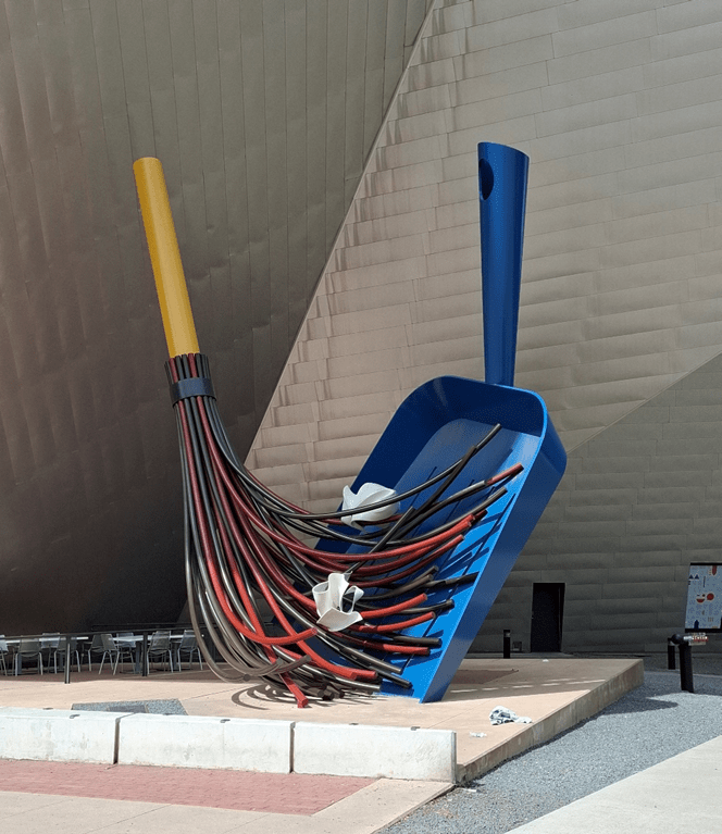 Nada mais designativo da arte contemporânea do que a escultura que está bem diante do museu. A foto não é boa, do ponto de vista de que não deixei nada para referência e, por isso, não é possível imaginar como essa vassoura e pá de lixo são grandes.