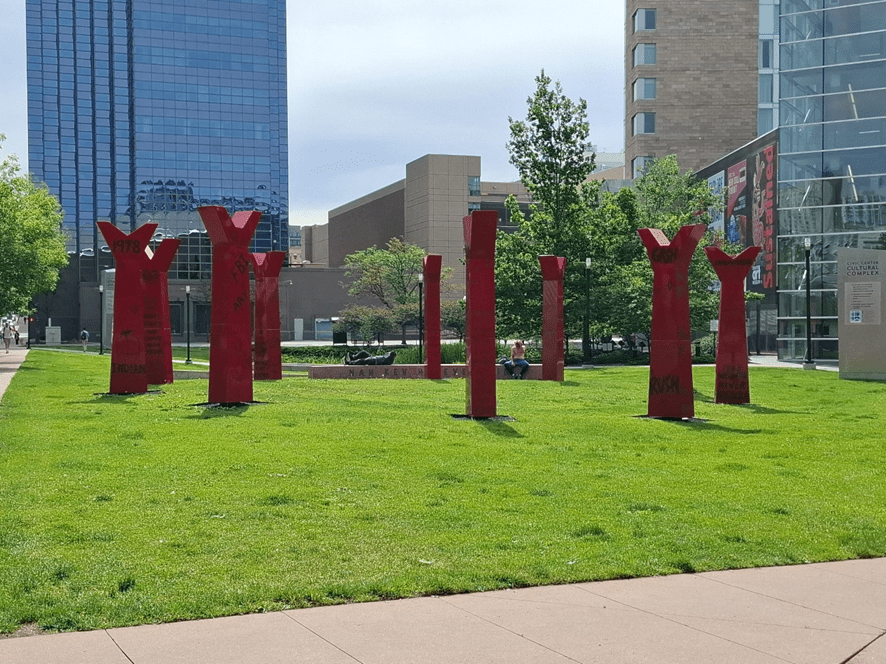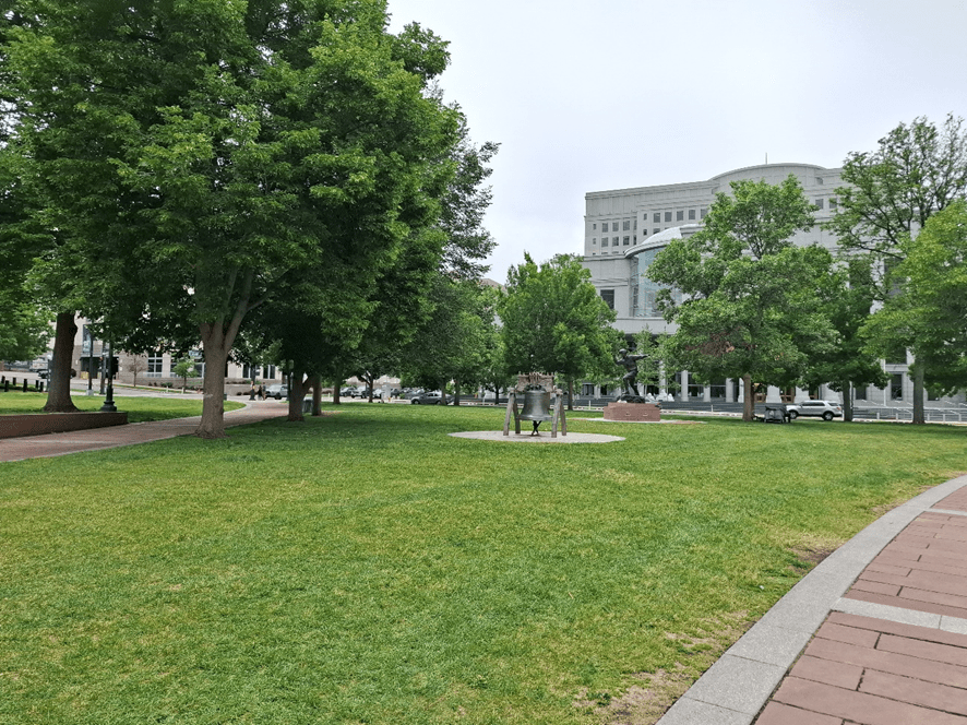 Tínhamos vontade de conhecer tanta coisa em Denver que não fizemos a visita ao prédio, mas gostamos de estar em seus arredores e ver os jardins que serviam de “casa” para alguns homeless que estavam aproveitando o sol da manhã. O jardim é grande, eles eram poucos e não quis que ficassem identificados, por isso só a vegetação aparece na foto e, na seguinte, o esquilo que também mora nesta praça.
