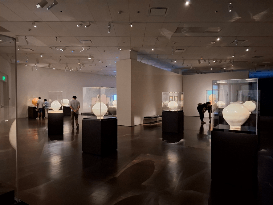 O museu embora seja denominado de arte moderna, tem obras de vários movimentos e diferentes países. Entre as exposições temporárias, por exemplo, chamou atenção uma denominada “Fases Lunares” que é composta de grandes potes brancos que eram usados pela elite coreana nos séculos XVII e XVIII. À primeira vista parecia monótona aquela sala, mas lendo os painéis, sabendo que esses potes eram usados para várias finalidades e que o nome da exposição faz referência ao fato de que, embora aparentemente iguais, os potes, como a lua, nunca são idênticos, porque argilas e queimas diferentes tornam o esmalte dos vasos distintos entre si, relativamente ao formato e aos tons do branco ao que se chama hoje de nude.