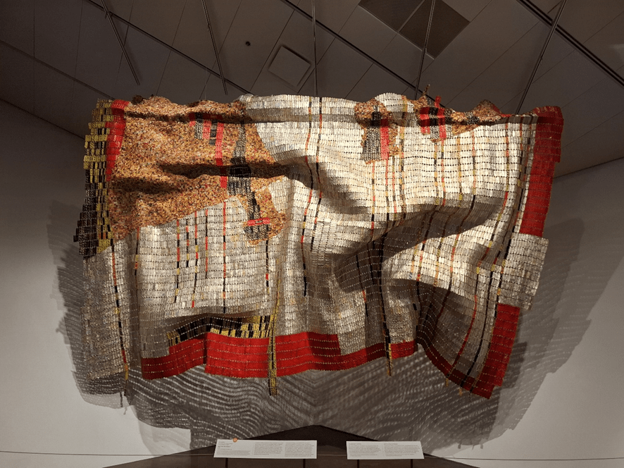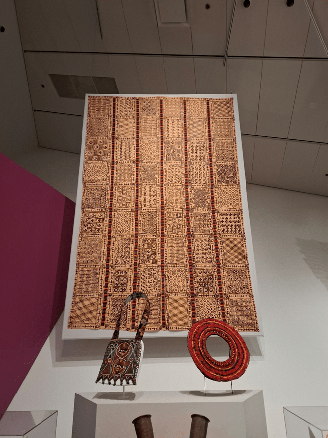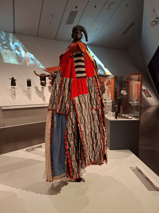 Também adorei as várias obras que são de artistas contemporâneos que buscam recuperar a arte de seus ancestrais, adotando técnicas e/ou materiais e/ou cores e/ou formas que eram utilizados por eles. Esta vestimenta, por exemplo, foi usada recentemente numa apresentação de balé e foi confeccionada por uma artista, recuperando a arte das roupas usadas em cerimônias e festas na África.