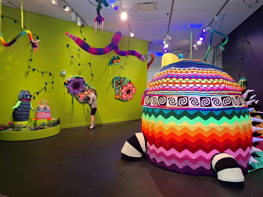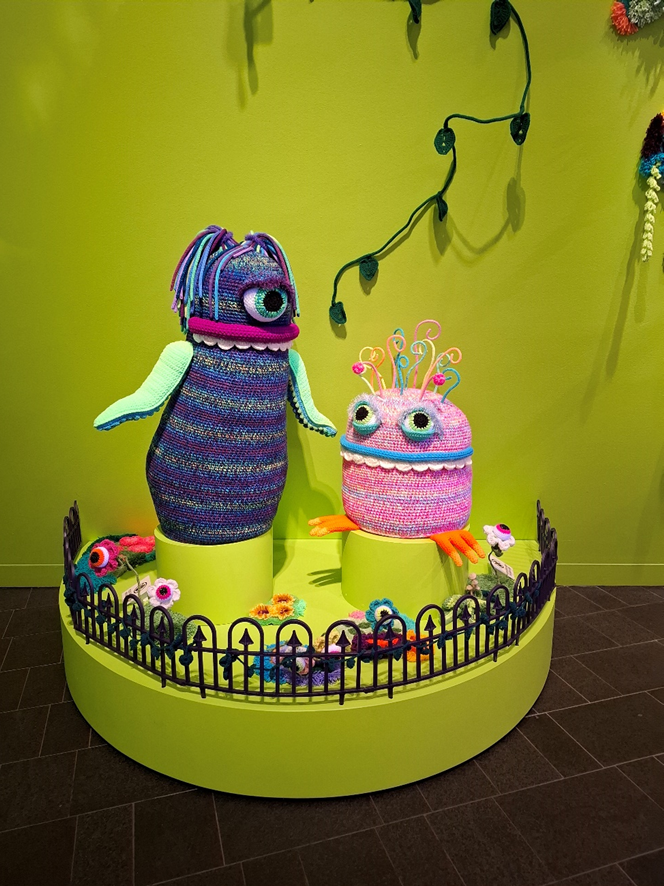 Numa das salas estavam expostas obras de arte feita com crochê e tricô, fazendo uma mistura interessante entre essas técnicas longevas de tecer e os personagens representados aludindo-se, pelo que eu senti, a bonecos de desenhos animados ou ilustrações atuais.