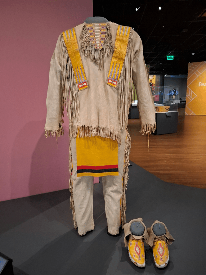 O traje completo de um indígena que vivia no Colorado chamou atenção pelos detalhes coloridos sobrepostos à vestimenta e aos sapatos de couro.