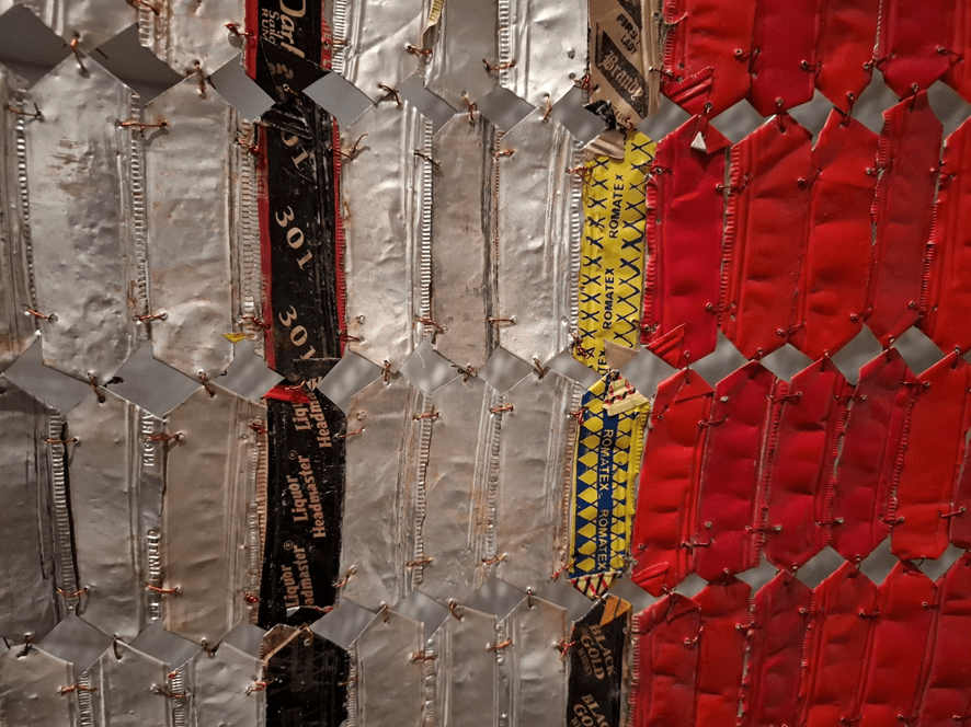 Fiquei mais impressionada ainda ao chegar perto e verificar que ele é feito de tirinhas costuradas em tecido (as vermelhas à direita na foto), entremeadas por tirinhas de alumínio de embalagens de bebidas (as prateadas e com inscrições de marcas que estão à esquerda no detalhe que se segue).